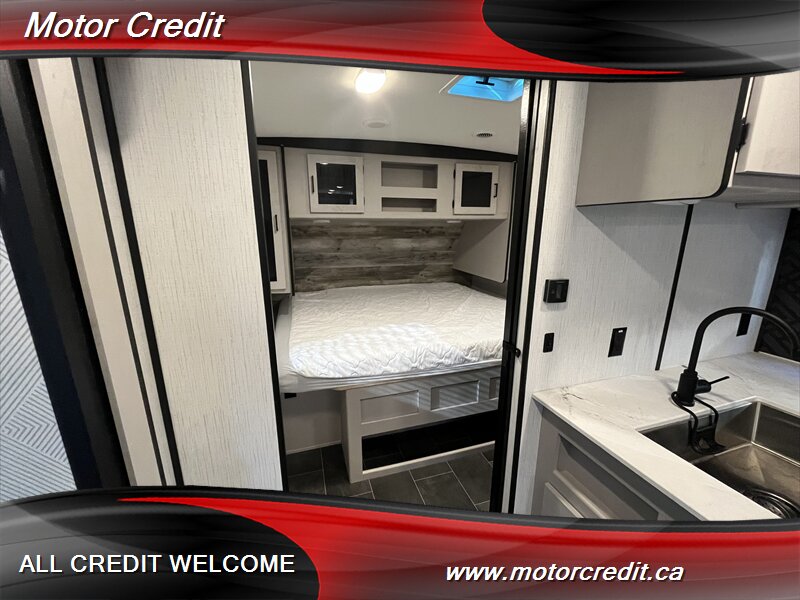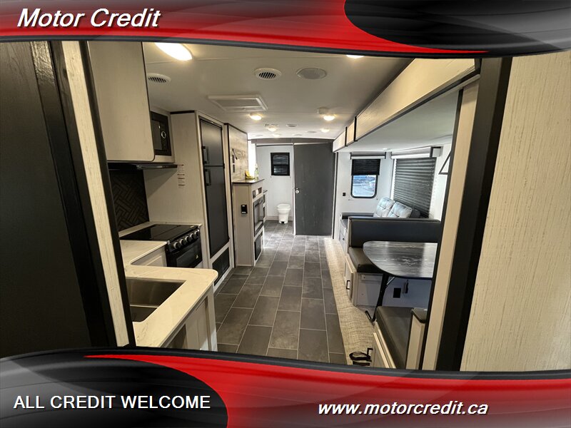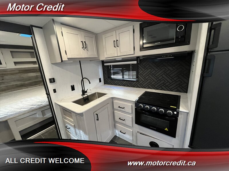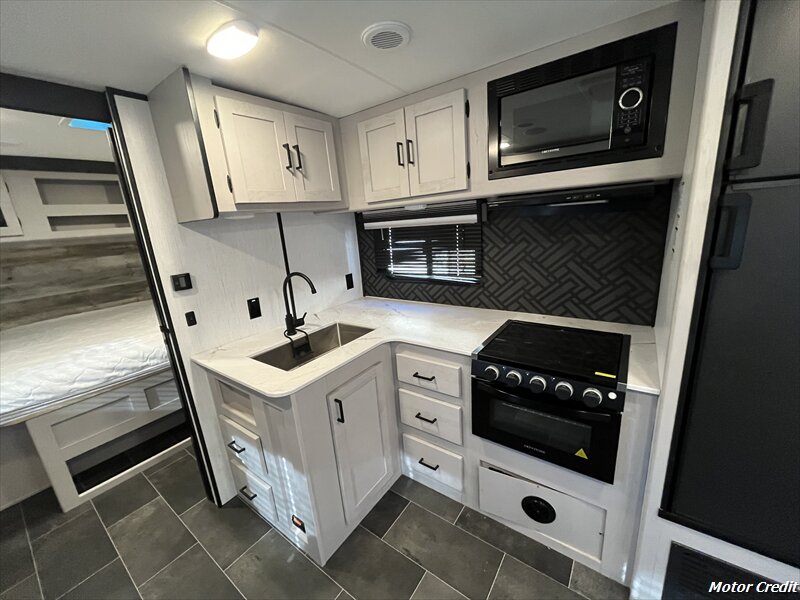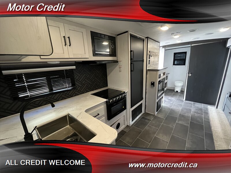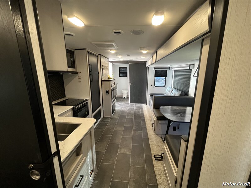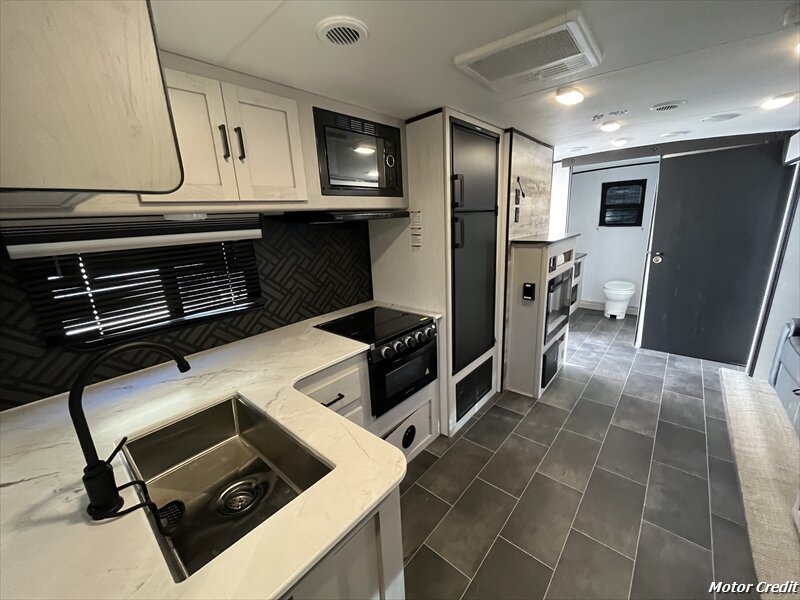 The kitchen is fully equipped with everything you need to whip up delicious meals on the go, including a large refrigerator, microwave, oven, and stove. Plus, the ample counter space and storage cabinets make meal prep a breeze.